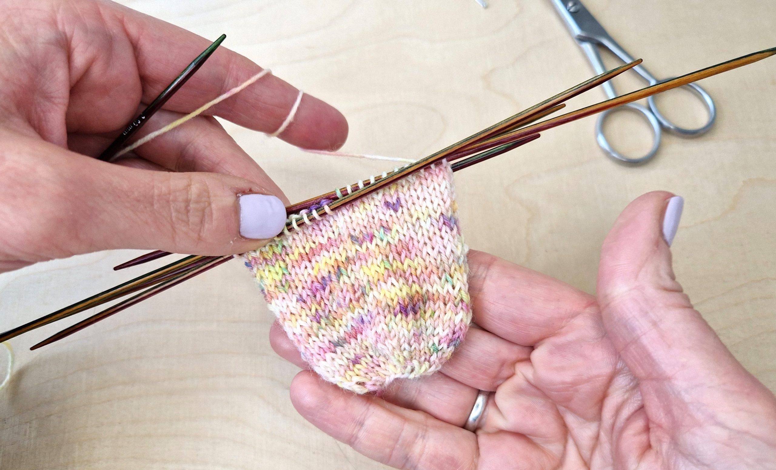 Für die Abnahmen teilst du die Maschen wieder gedanklich in zwei Hälften und strickst jeweils die beiden Maschen vor der Mitte und die letzten beiden Maschen auf der Nadel zusammen. Das ergibt pro Abnahmerunde wieder acht Maschen weniger, gleichmäßig über alle vier Nadeln verteilt. Nach jeder Abnahmerunde folgenden drei Zwischenrunden ohne Abnahmen. Diesen Wechsel wiederholst du, bis du noch insgesamt acht Maschen auf den Nadeln hast, also zwei pro Nadel.