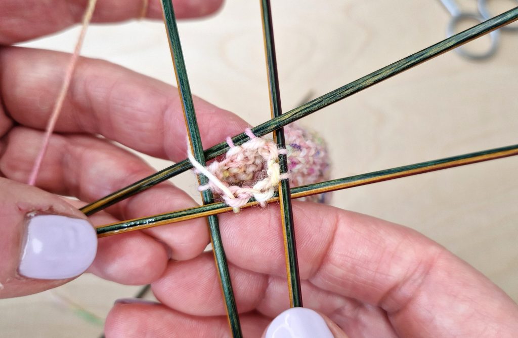 Schlage 16 Maschen an – ich mache das immer mit zwei Nadeln gleichzeitig, damit die Maschen schön gleichmäßig werden. Verteile sie dann gleichmäßig auf vier Nadeln und schließe sie zur Runde. Stricke jetzt eine Runde ohne Zunahmen, um die Runde zu stabilisieren. In der Mitte bleibt dabei ein relativ großes Loch – das ist so gewollt, denn du brauchst es später noch zum Füllen.