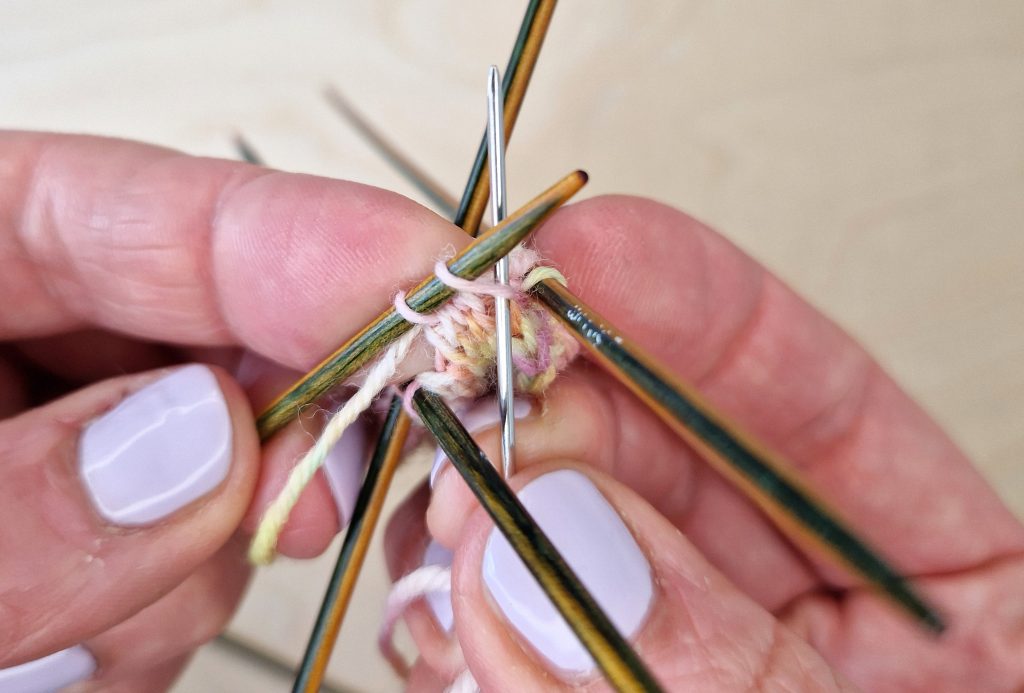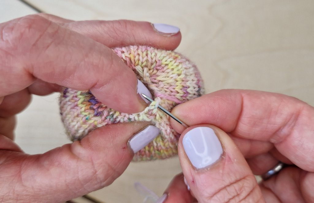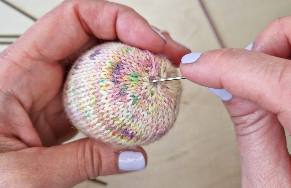 Schneide den Faden großzügig ab, ziehe ihn auf die Vernähnadel und gehe einmal durch jede verbliebene Masche. Ziehe das Loch damit zu, sichere den Faden und vernähe ihn ins Innere des Eis.