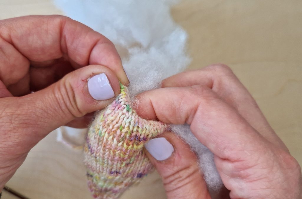 Fülle das Ei jetzt durch die Öffnung unten gleichmäßig mit Füllwatte. Dann nimmst du den Anfangsfaden, ziehst ihn auf die Vernähnadel und schließt das untere Loch, indem du von außen in jede Masche einstichst und das Loch zuziehst. Sichere auch hier den Faden und vernähe ihn ins Innere.